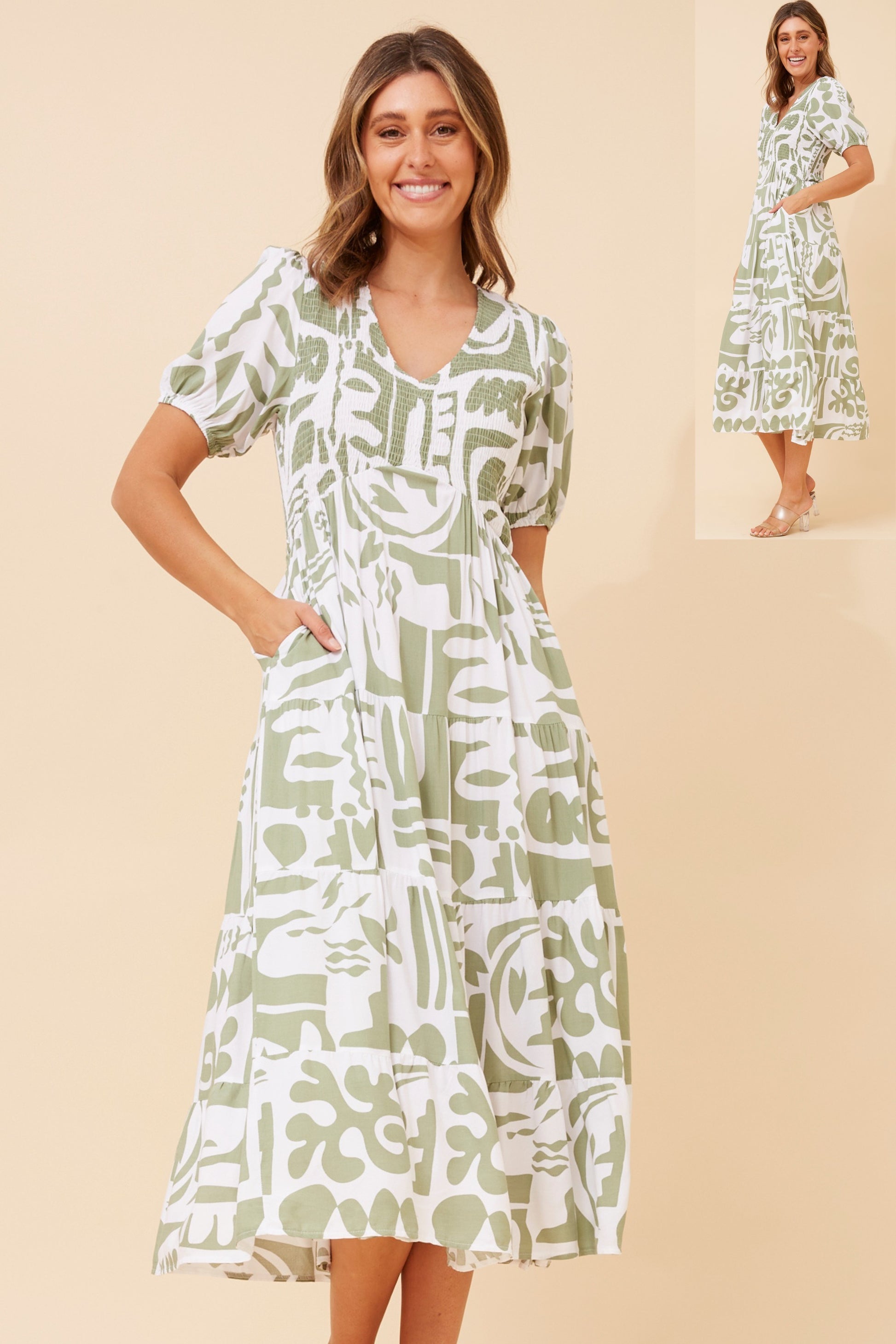 Make a statement in the Seren Abstract Print Dress—a gorgeous sage maxi that's equal parts elegant and fun. The eye-catching abstract print pairs beautifully with a flattering shirred bodice and daring deep V-neckline, while playful puff sleeves add a touch of whimsy. Whether you're heading to dinner or celebrating the holidays, this dress delivers effortless sophistication with personality to spare. Slip it on and feel fabulous.