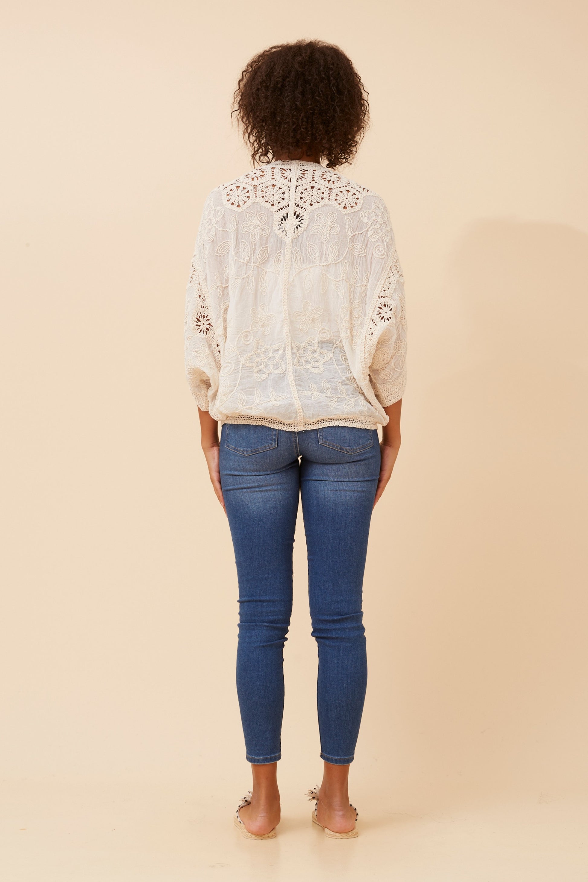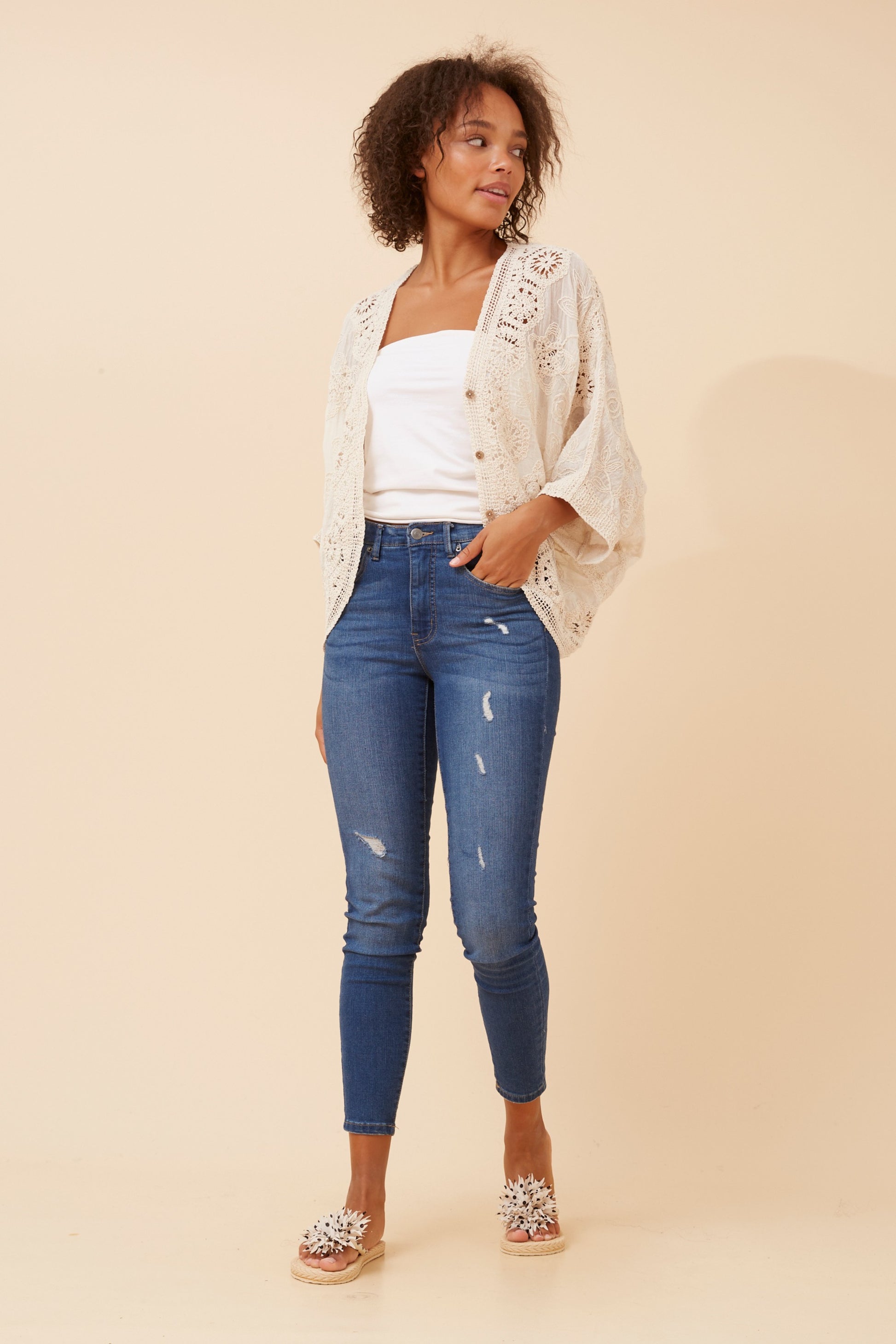 Absolutely gorgeous and endlessly versatile, this boho lace crochet cardigan is your new wardrobe essential. Rock it as a standalone top or layer it up for extra warmth—the choice is yours. With its flattering crop length and charming front button details, it's designed to turn heads. Style it with our flowing maxi skirts for an effortlessly chic vibe, or pair with wide-leg pants for a modern twist. Pure boho bliss in creamy perfection.