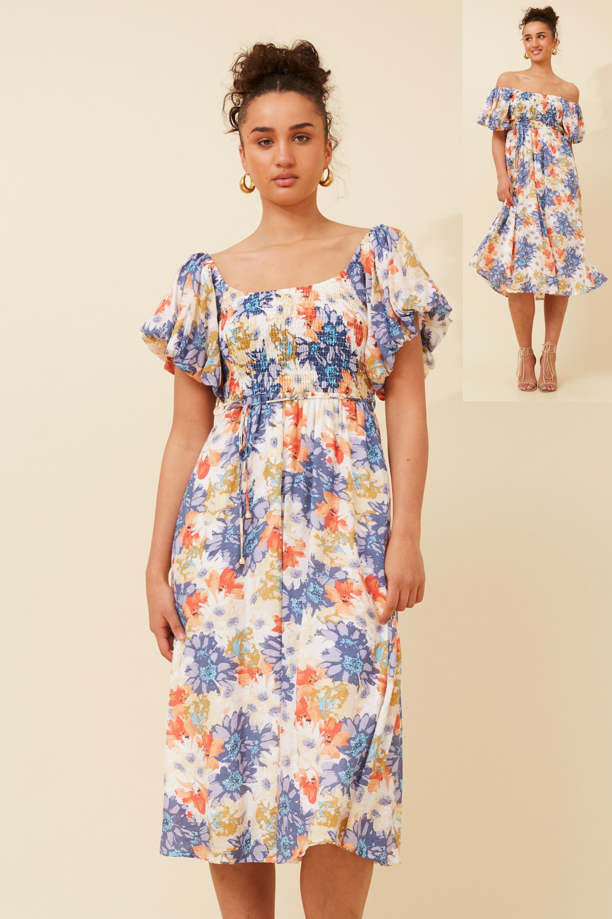 Get ready to bloom in the Piper Floral Midi Dress! With effortless femininity, this dress is perfect for any event. The square elastic neckline can be worn off the shoulder, while the 3/4th balloon sleeves with elastic cuffs add a playful touch. The floral print, tiered design, and midi length make this dress a must-have for any wardrobe. Stay comfortable in the regular fit, and enjoy the convenience of partial lining.