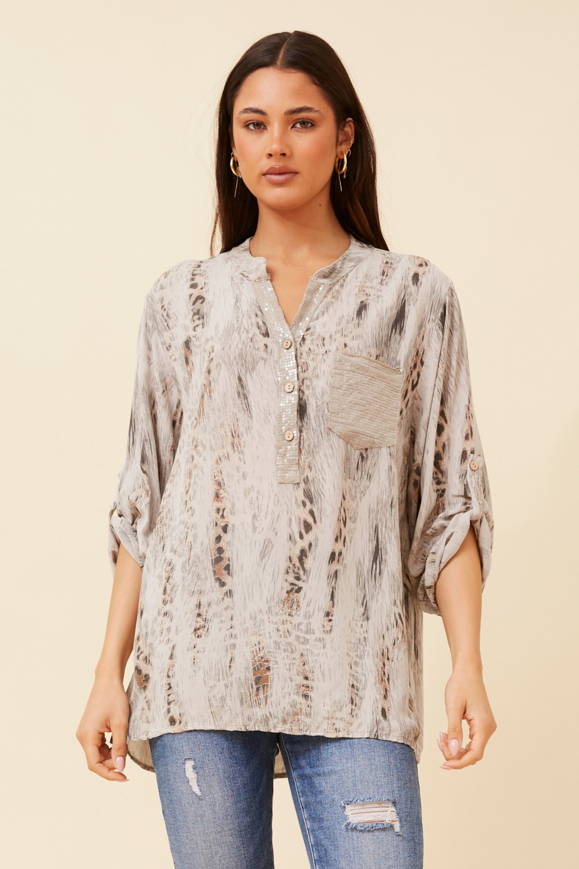 Feel stylish and chic in our Elya Italian Blouse in White, designed to add a playful edge to your wardrobe. Featuring sparkling sequins and a hint of leopard print, it’s easy to style with your favourite jeans or tucked into skirts for a fun, fashionable look.