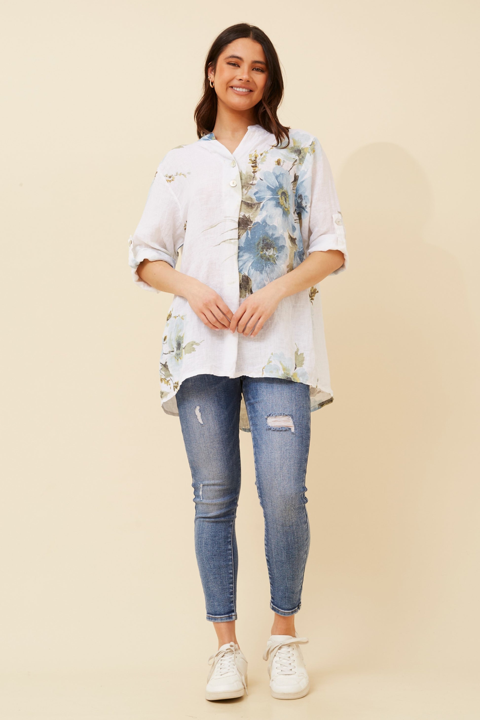 Elevate your style with our Isotta Floral Printed Top. Made with luxurious linen, this unique and beautiful top is the perfect addition to your wardrobe. The floral detailing adds a touch of elegance while the versatile style allows you to pair it with any favorite pants for a polished look. Upgrade your fashion game with this must-have piece.