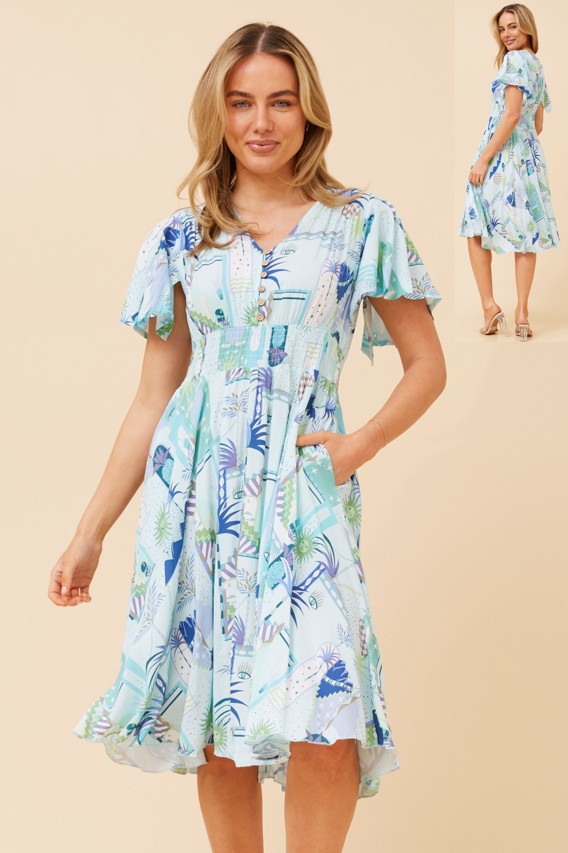 Flaunt your fun and carefree style with the Sandy Floral Midi Dress. This versatile dress features a V neckline, front button detailing, and short sleeves for a casual yet chic look. The shirred elastic waistband and functional side pockets add convenience and comfort, perfect for any outing or picnic. Embrace the ditsy floral print in a knee length dress that's sure to turn heads.