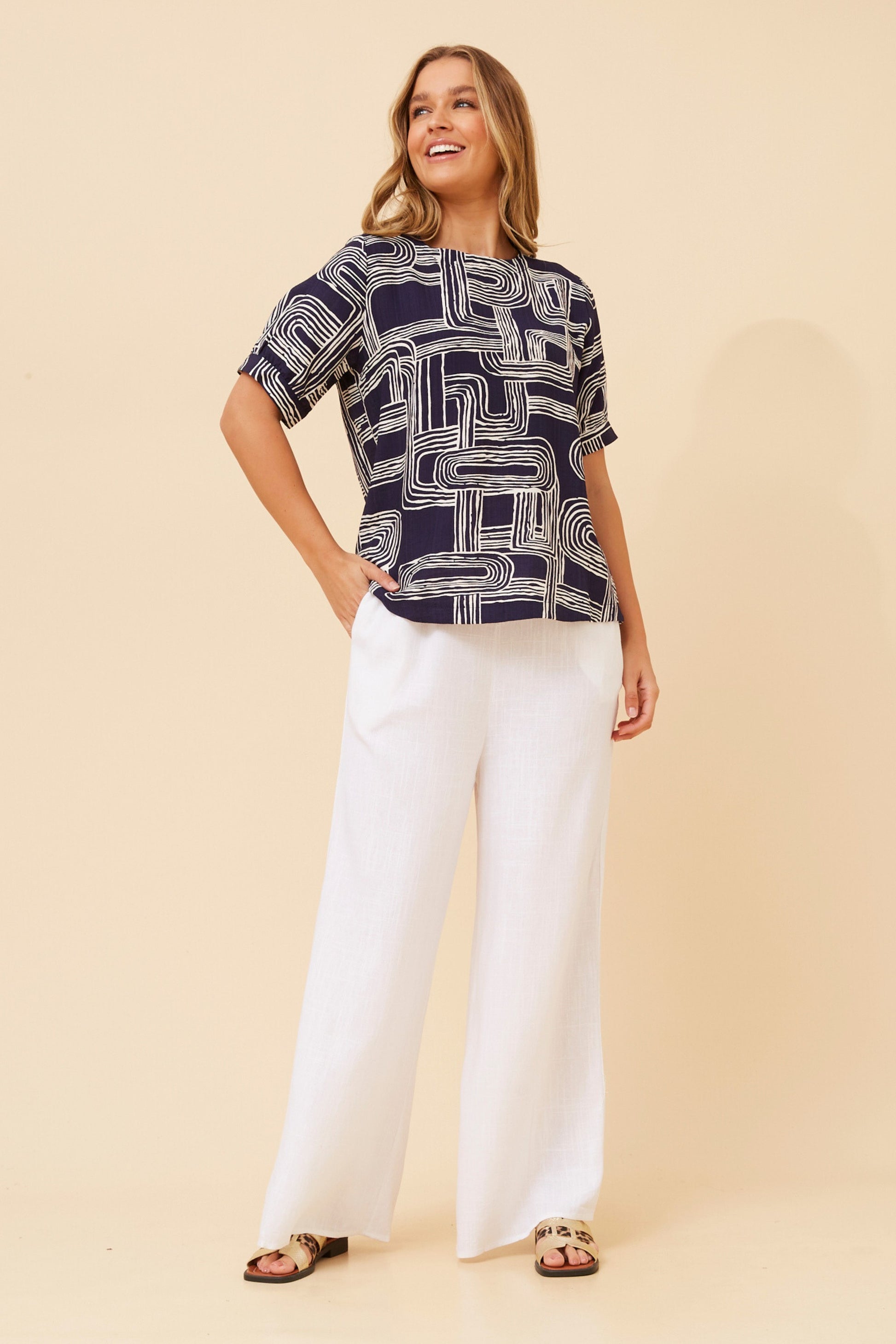 Stay cool and comfy in our Carolyn Top! Perfect for any casual occasion, with an abstract print and easy styling, this top is a must-have. The round neck and short sleeves add to the relaxed and effortless look. Pair with jeans, shorts, or skirts for a versatile and trendy outfit.