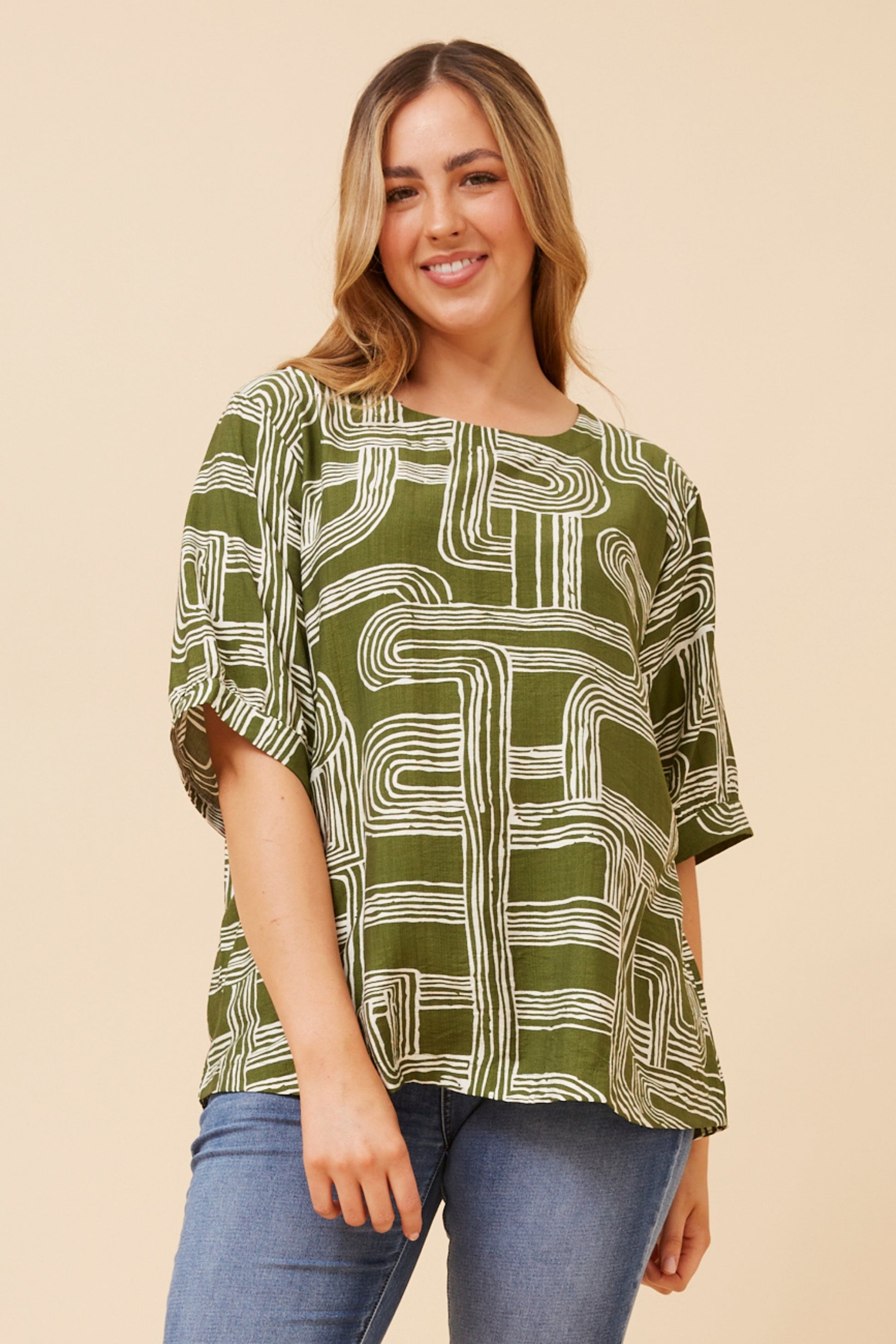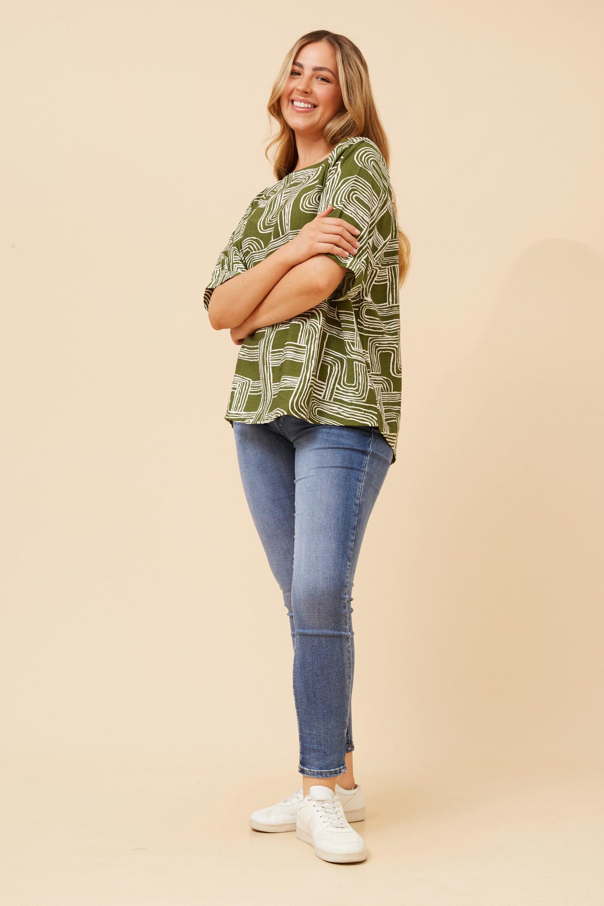 Stay cool and comfy in our Carolyn Top! Perfect for any casual occasion, with an abstract print and easy styling, this top is a must-have. The round neck and short sleeves add to the relaxed and effortless look. Pair with jeans, shorts, or skirts for a versatile and trendy outfit.